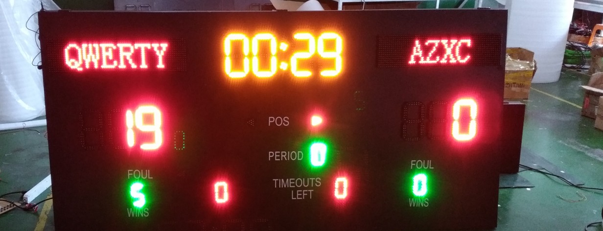 Scores go 0-999 and clock counts down from 99:59 maximum, 1/10th of a second timing feature in last minute standard and popular model displays foules Timeoutd and Possession. Each team name panel has room for 8 charaters maximum